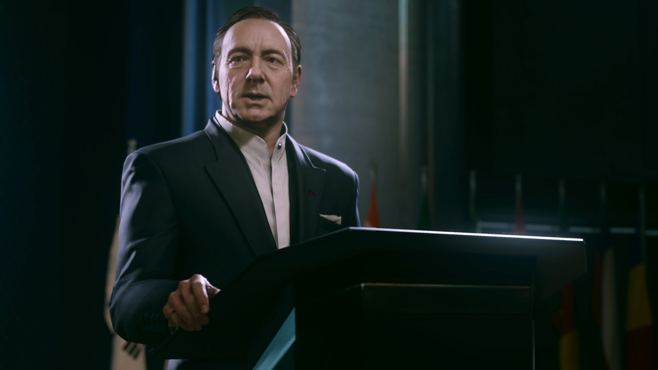 This new Call of Duty is undeniably a gorgeous one. Impressive lighting and detailed character models help the game come to life. While the environments aim for realism, they mostly avoid the drab browns and greys that saturated previous entries in the franchise, thanks in part to the splashes of color provided by some of the futuristic weaponry in the game. The pre-rendered cutscenes showcase some of the most realistic characters I have seen in a game, and their beauty helps the performances of Kevin Spacy and the other actors really shine.